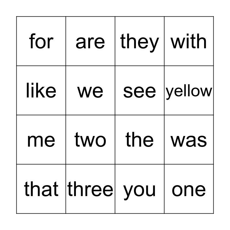 This bingo card has 16 words: three, was, they, for, me, are, the, you, like, we, that, with, two, yellow, see and one.
