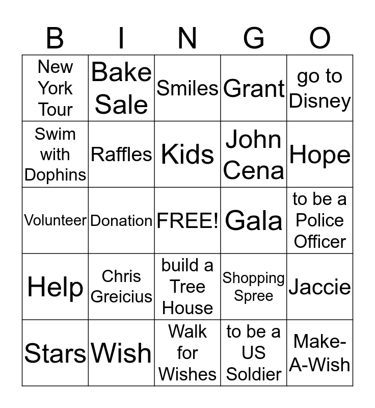 This bingo card has a free space and 24 words: Chris Greicius, Wish, Kids, Stars, go to Disney, New York Tour, Swim with Dophins, Bake Sale, Gala, build a Tree House, John Cena, Volunteer, Shopping Spree, Jaccie, Raffles, to be a US Soldier, to be a Police Officer, Smiles, Hope, Donation, Make-A-Wish, Help, Grant and Walk for Wishes.