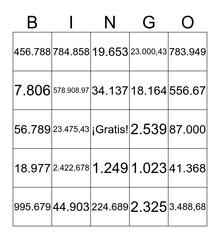 This bingo card has a free space and 26 words: 1.249, 2.325, 34.137, 44.903, 783.949, 456.788, 7.806, 784.858, 87.000, 1.023, 18.164, 56.789, 41.368, 995.679, 23.475,43, 1.679, 23.000,43, 18.977, 19.653, 3.488,68, 556.67, 224.689, 2.539, 2.422,678, 578.908.97 and 32.374.