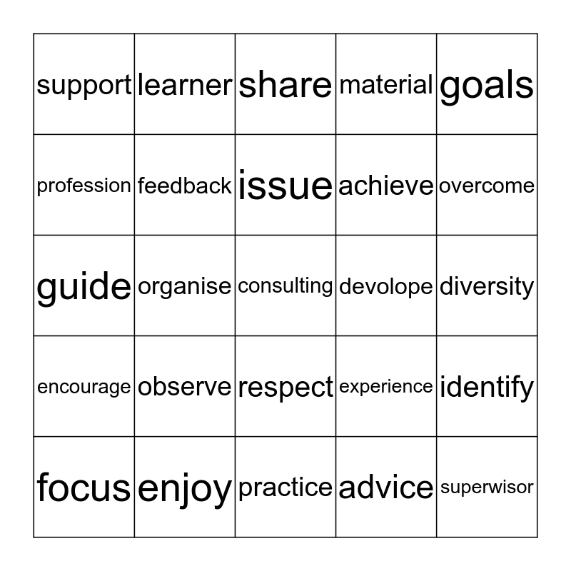 This bingo card has a free space and 29 words: focus, mentor, organise, mentee, support, share, feedback, observe, devolope, enjoy, diversity, superwisor, practice, advice, overcome, behaviour, respect, encourage, goals, guide, experience, motivate, achieve, profession, material, learner, identify, issue and willing.