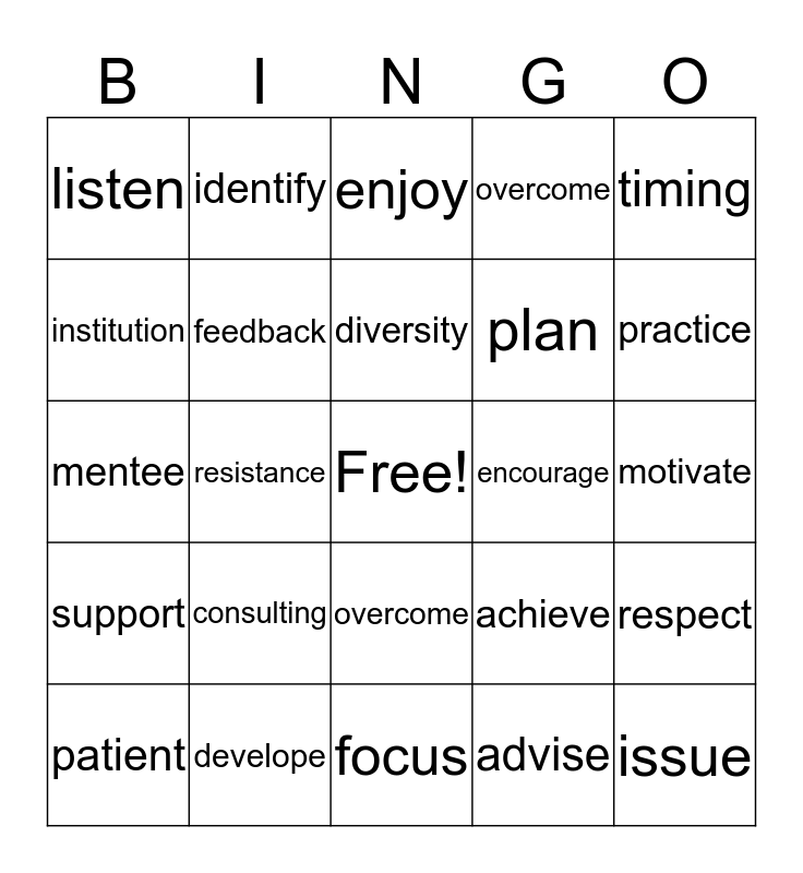 This bingo card has a free space and 29 words: patient, share, resistance, observe, listen, enjoy, feedback, consulting, encourage, develope, motivate, issue, focus, advise, practice, guide, overcome, support, timing, mentee, achieve, mentor, plan, institution, overcome, identify, respect, diversity and willing.