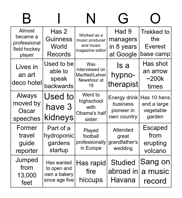 This bingo card has 65 words: Is a level 1 sommelier, Was a journalist who interviewed Titanic survivors, Has explosives license in Colorado, Escaped from erupting volcano, Hitchhiked from England to Morocco for charity, Jumped off a bridge, Has 2 Guinness World Records, Was captain of high school bowling team, Was interviewed on MacNeil/Lehrer Newshour at 19, Each member of family was born in a different country, Played football professionally in Europe, Sang in all-girls band, Has 10 hens and a large vegetable garden, Trekked to the Everest base camp, Makes own vermouth, Lives in an art deco hotel, Used to have 3 kidneys, Almost became a professional field hockey player, Sold planes in Africa while consulting, Is a hypno-therapist, Part of a hydroponic gardens startup, Former travel guide reporter, Had 9 managers in 8 years at Google, Always loses car in parking lots, Cannot fall asleep even with the slightest amount of light, First job was synchronized speaker/dubbing actor, Family pets were each named "Puppy" and "Kitty", Used to sing in a metal band, Went to highschool with Obama's half sister, Spent childhood summers on movie sets, Jumped from 13,000 feet, Spent an evening in a London sewer, Certified Yoga teacher, Shares birthday with Bilbo and Frodo Baggins, Attended great grandfather's wedding, Has wanted to open and own a bakery since age five, Has a 1-year-old corgi named Taxi, Always moved by Oscar speeches, Studied abroad in Havana, Shared queso with President Obama, Used to be able to speak backwards, Stuttered till age 5, Energy drink business pioneer in own country, Is a hobbyist jewelry designer, Fell through the ice of a frozen lake, Dreamjob as a child was a policewoman, Has shot an arrow ~200k times, Was an aerobics instructor in the 90s, Sang on a music record, Worked at a wildlife park and fed the koalas, Can’t tell own children apart, Cofounded and ran a record company in Ireland, Plays the guitar and harmonica, Has rapid fire hiccups, Used to work in a newsroom, Was once rescued at sea, Can program Z80 and 8086 microprocessors directly in assembly language, Worked as a music producer and music magazine editor, Lived in 7 different countries, Has seen The Cure fifteen times, Crazy about skiing even though there is no snow or mountains in homeland, Saved a friend from falling off a waterfall, Did bungee jumping and skydiving before, Is an ex-journalist and Swam between continents in one day.