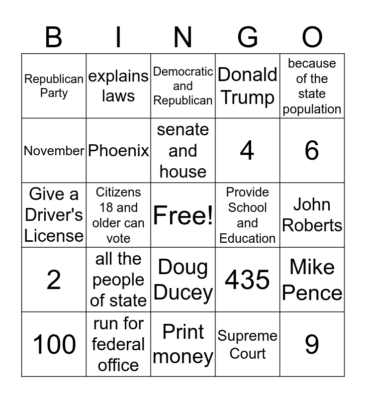 This bingo card has a free space and 30 words: run for federal office, serve on a jury, Citizens 18 and older can vote, Nancy Pelosi, Republican Party, Democratic and Republican, Phoenix, Doug Ducey, Provide School and Education, Print money, John Roberts, 9, Supreme Court, reviews laws, 6, Martha Mcsally, 435, 2, all the people of state, because of the state population, Give a Driver's License, create an army, explains laws, 4, November, Donald Trump, Mike Pence, 100, senate and house and Checks and balances.