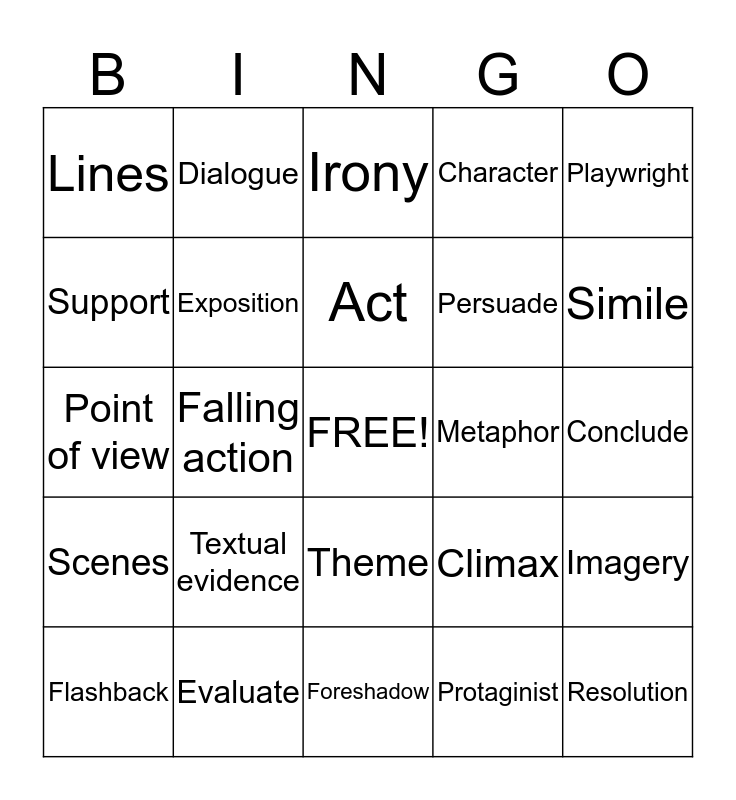This bingo card has a free space and 24 words: Textual evidence, Evaluate, Act, Flashback, Playwright, Lines, Support, Dialogue, Metaphor, Theme, Persuade, Point of view, Climax, Imagery, Exposition, Protaginist, Conclude, Irony, Simile, Falling action, Resolution, Scenes, Character and Foreshadow.