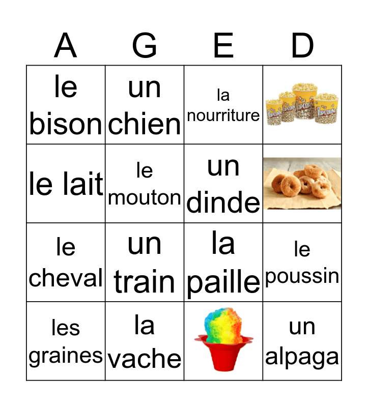 This bingo card has 4 images and 16 words: le poussin, une plante, la nourriture, les animaux, les graines, le lait, la vache, le bison, le cheval, un chien, un train, la paille, le mouton, un alpaga, un dinde and le poule.