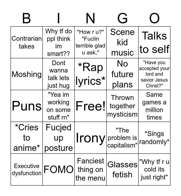 This bingo card has a free space and 24 words: Fucjed up posture, FOMO, *Rap lyrics*, Executive dysfunction, Talks to self, Contrarian takes, Moshing, Why tf do ppl think im smart??, Thrown together mysticism, Irony, No future plans, Puns, "The problem is capitalism", *Sings randomly*, Dont wanna talk lets just hug, Glasses fetish, Same games a million times, "How r u?" "Fuclin terrible glad u ask,", "Have you accepted your lord and savior Jesus Christ?", "Yea im working on some stuff rn", "Why tf r u cold its just right", *Cries to anime*, Scene kid music and Fanciest thing on the menu.