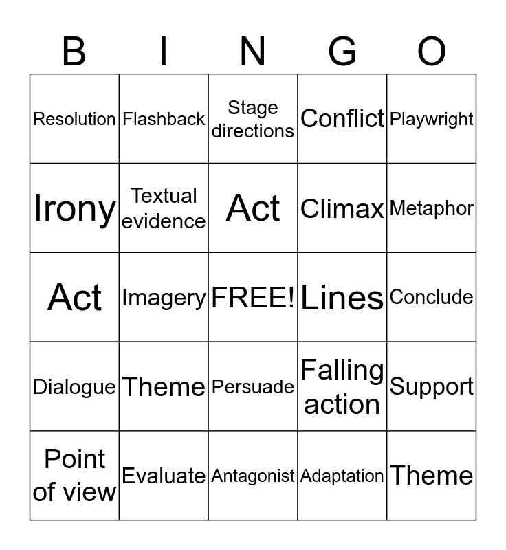 This bingo card has a free space and 24 words: Theme, Evaluate, Act, Point of view, Playwright, Resolution, Irony, Flashback, Lines, Persuade, Climax, Act, Falling action, Support, Textual evidence, Adaptation, Conclude, Stage directions, Metaphor, Imagery, Theme, Dialogue, Conflict and Antagonist.