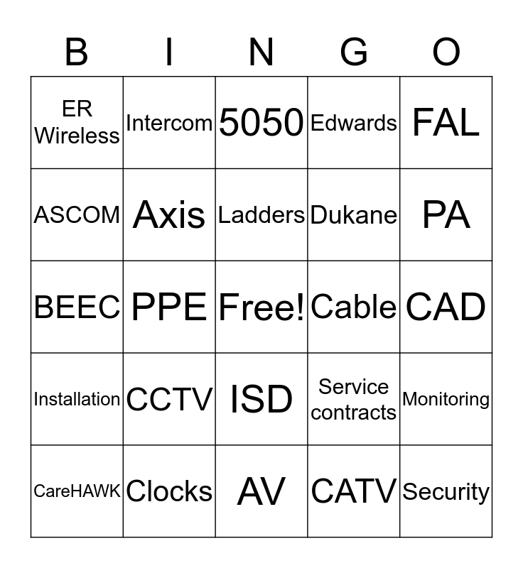 This bingo card has a free space and 44 words: BES, Security, Devices, CareHAWK, Access Control, CATV, 5050, BOSCH, FAL, Clocks, Edwards, Cable, ISD, CCTV, Nurse Call, AV, 1620A, BEEC, HUGS, PA, Intercom, Life Safety, S2 Security, ER Wireless, PM, CAD, Functional Testing, Programming, Service contracts, Installation, EST3, Monitoring, Alarms, Badges, PPE, Safety Glasses, Hard Hats, Backpacks, Ladders, ASCOM, Dukane, Stanley, Axis and Techs.