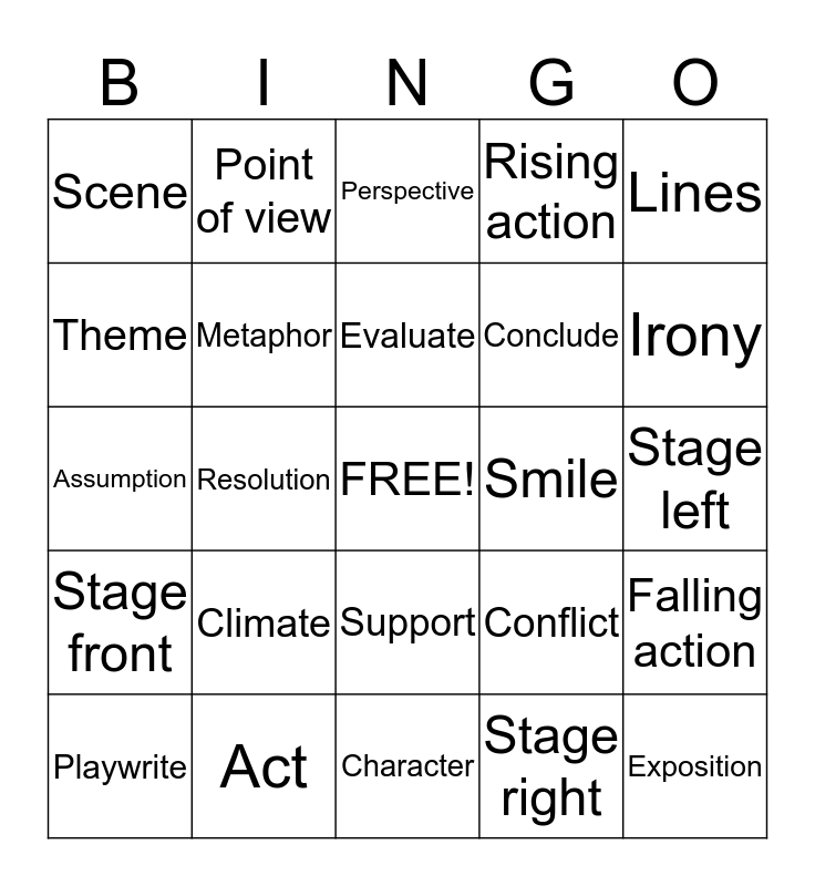 This bingo card has a free space and 24 words: Climate, Act, Evaluate, Playwrite, Lines, Scene, Theme, Point of view, Smile, Support, Conclude, Assumption, Conflict, Falling action, Metaphor, Stage right, Stage left, Perspective, Irony, Resolution, Exposition, Stage front, Rising action and Character.
