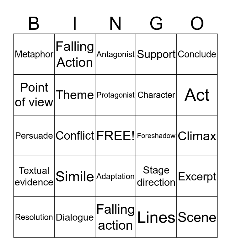 This bingo card has a free space and 24 words: Simile, Dialogue, Protagonist, Resolution, Conclude, Metaphor, Point of view, Falling Action, Foreshadow, Adaptation, Character, Persuade, Stage direction, Excerpt, Theme, Lines, Climax, Antagonist, Act, Conflict, Scene, Textual evidence, Support and Falling action.