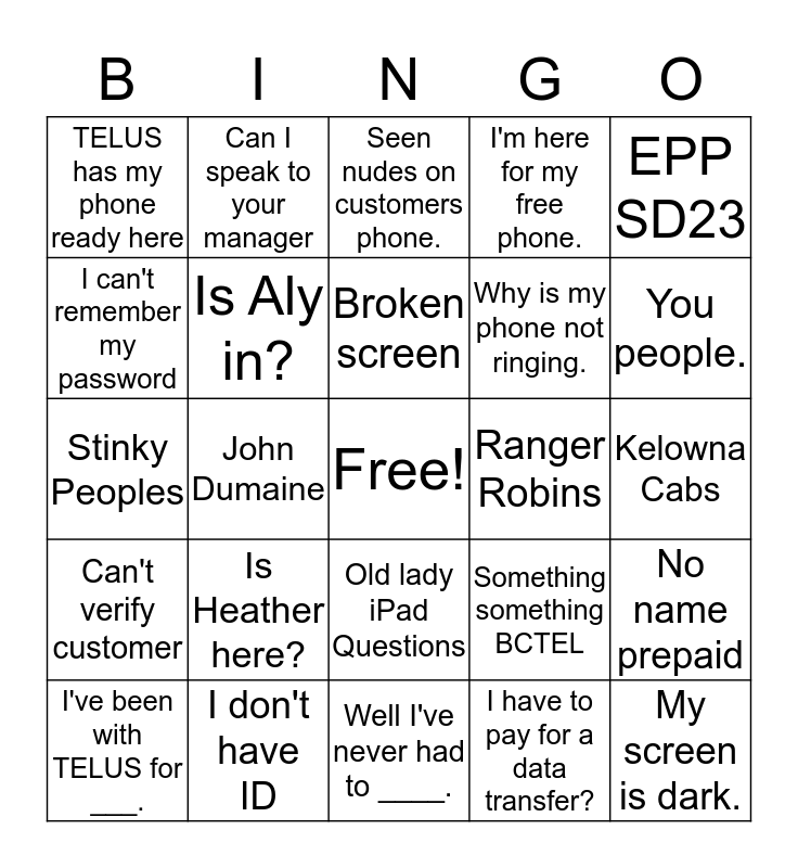 This bingo card has a free space and 24 words: I've been with TELUS for ___., Is Heather here?, Broken screen, I have to pay for a data transfer?, EPP SD23, TELUS has my phone ready here, Can I speak to your manager, Seen nudes on customers phone., Ranger Robins, Kelowna Cabs, Stinky Peoples, Is Aly in?, Something something BCTEL, No name prepaid, I can't remember my password, I don't have ID, Well I've never had to ____., I'm here for my free phone., You people., Can't verify customer, John Dumaine, Old lady iPad Questions, Why is my phone not ringing. and My screen is dark..