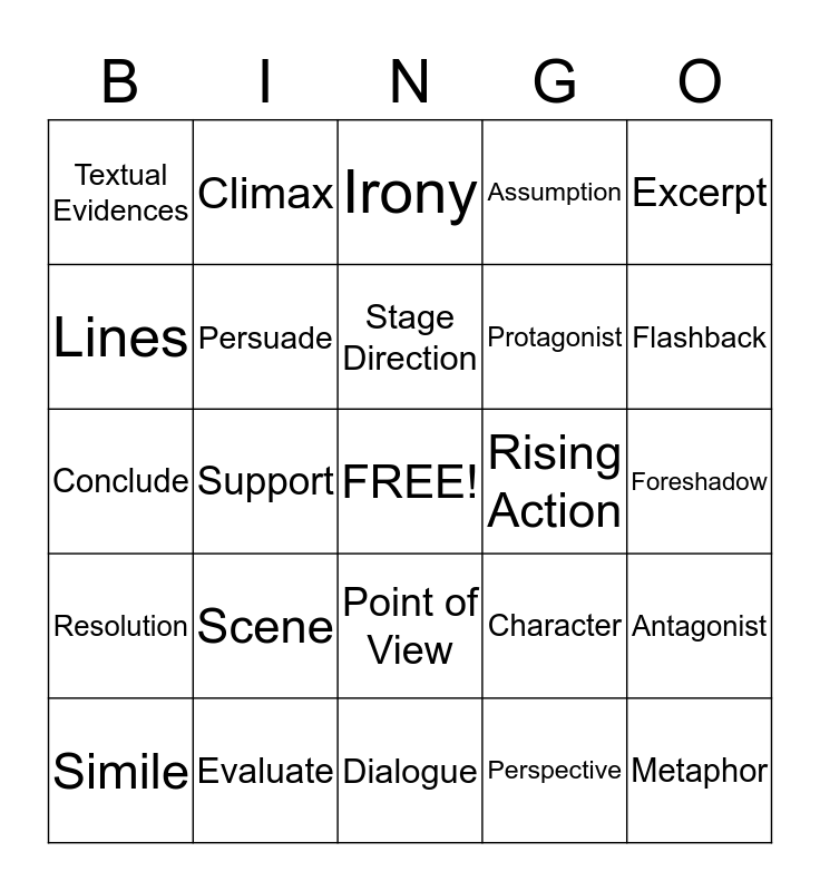 This bingo card has a free space and 24 words: Scene, Evaluate, Stage Direction, Simile, Excerpt, Textual Evidences, Lines, Climax, Rising Action, Point of View, Protagonist, Conclude, Character, Antagonist, Persuade, Perspective, Foreshadow, Irony, Flashback, Support, Metaphor, Resolution, Assumption and Dialogue.