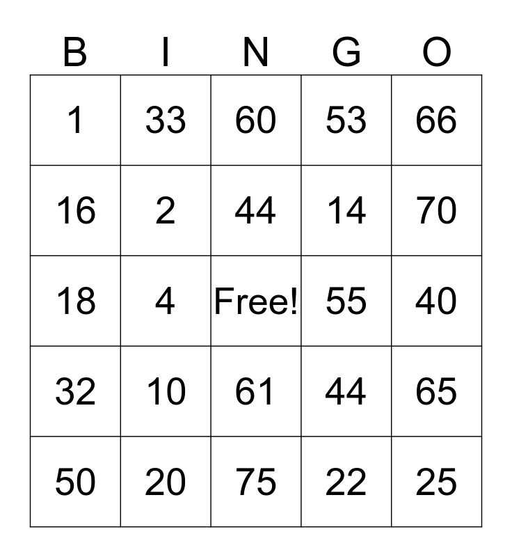 This bingo card has a free space and 24 words: 10, 20, 44, 50, 66, 1, 16, 33, 55, 61, 14, 18, 44, 65, 2, 22, 40, 60, 70, 4, 25, 32, 53 and 75.