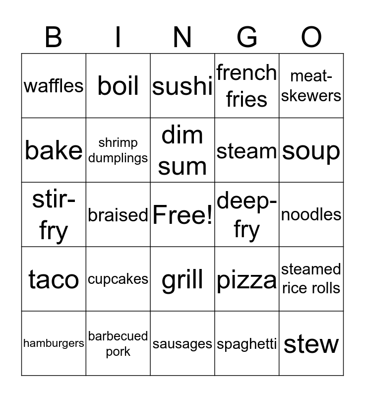 This bingo card has a free space and 24 words: cupcakes, barbecued pork, dim sum, hamburgers, meat-skewers, waffles, bake, boil, deep-fry, grill, steam, stir-fry, pizza, steamed rice rolls, shrimp dumplings, spaghetti, noodles, sushi, soup, braised, stew, taco, french fries and sausages.