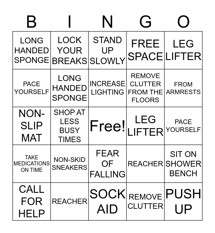 This bingo card has a free space and 26 words: FEAR OF FALLING, REMOVE CLUTTER, INCREASE LIGHTING, REACHER, LEG LIFTER, LONG HANDED SPONGE, PACE YOURSELF, LOCK YOUR BREAKS, PACE YOURSELF, REACHER, REMOVE CLUTTER FROM THE FLOORS, NON-SLIP MAT, SIT ON SHOWER BENCH, CALL FOR HELP, SHOP AT LESS BUSY TIMES, CALLING AHEAD, FREE SPACE, TAKE MEDICATIONS ON TIME, STAND UP SLOWLY, PUSH UP, FROM ARMRESTS, SOCK AID, LEG LIFTER, NON-SKID SNEAKERS, LONG HANDED SPONGE and CLOTHES THAT DO NOT DRAG.