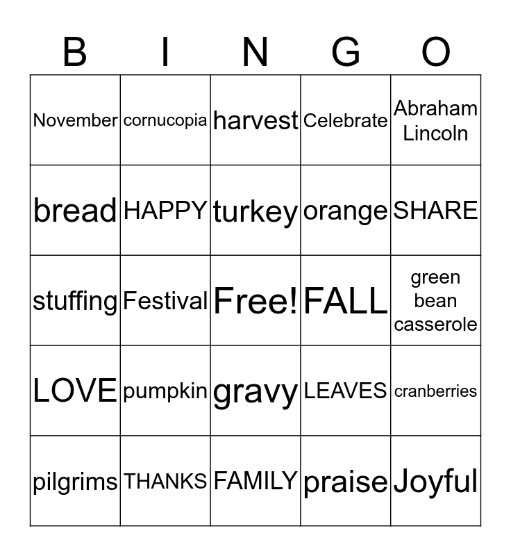 This bingo card has a free space and 24 words: pumpkin, THANKS, turkey, pilgrims, Abraham Lincoln, November, bread, cornucopia, FALL, gravy, orange, stuffing, LEAVES, cranberries, HAPPY, praise, green bean casserole, harvest, SHARE, Festival, Joyful, LOVE, Celebrate and FAMILY.