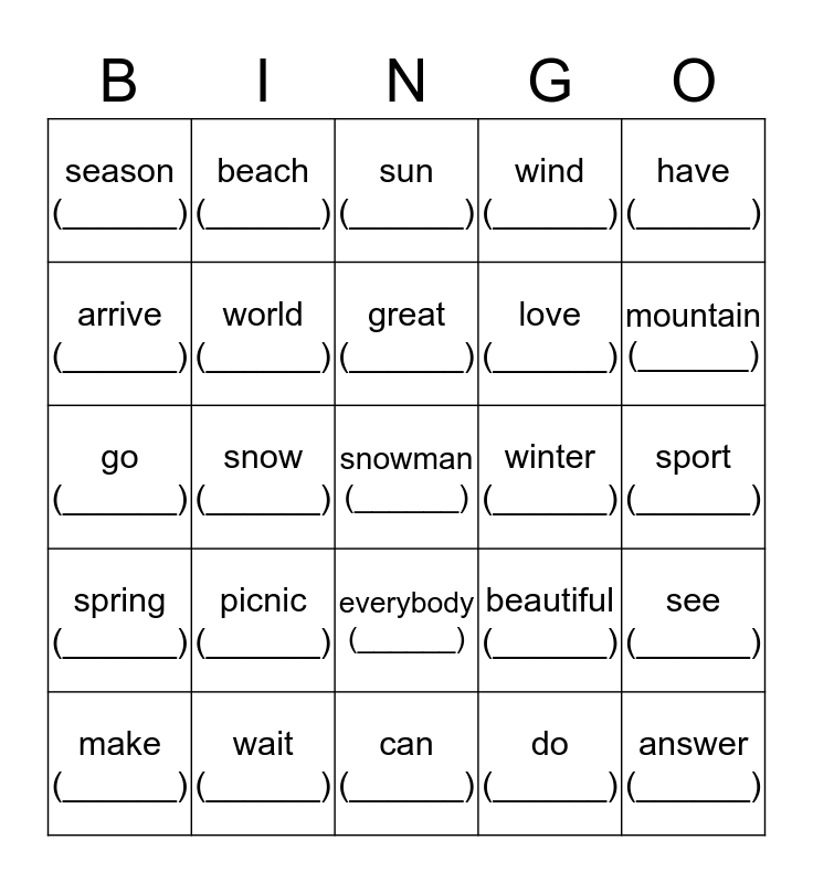 This bingo card has a free space and 29 words: say (______), wait (______), sun (______), know (______), have (______), season (______), world (______), great (______), winter (______), see (______), make (______), snow (______), do (______), answer (______), go (______), sound (______), can (______), beautiful (______), mountain (______), spring (______), picnic (______), favorite (______), love (______), sport (______), arrive (______), beach (______), everybody (______), wind (______) and run (______).