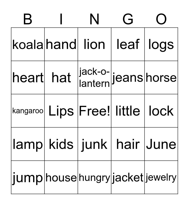 This bingo card has a free space and 29 words: jump, kick, Lips, January, koala, lion, hat, kids, little, house, lock, jewelry, hungry, jacket, horse, key, junk, lamp, logs, kangaroo, hair, kite, jeans, heart, leaf, hand, June, jack-o-lantern and hot-dog.