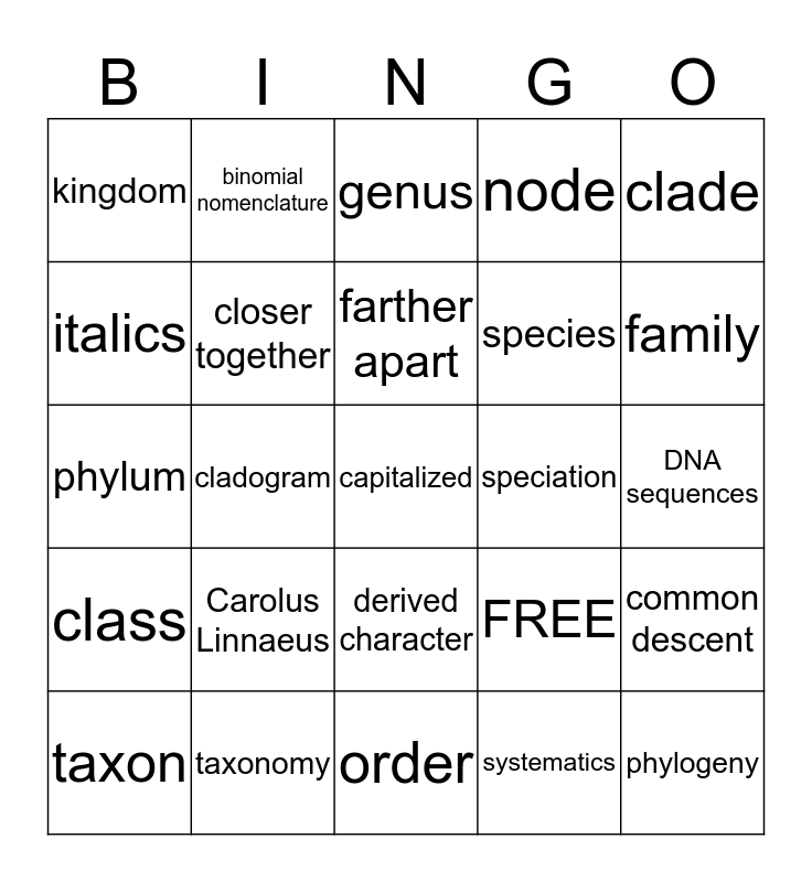 This bingo card has 25 words: Carolus Linnaeus, order, farther apart, taxon, clade, kingdom, italics, binomial nomenclature, speciation, derived character, species, phylum, FREE, common descent, closer together, phylogeny, DNA sequences, genus, family, cladogram, capitalized, taxonomy, class, node and systematics.