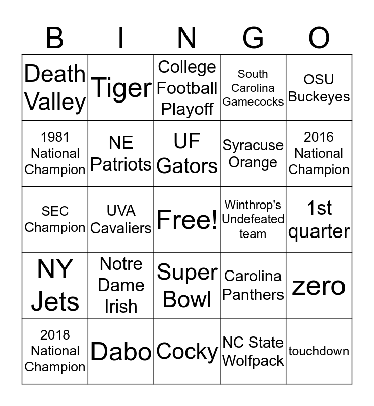 This bingo card has a free space and 46 words: Clemson Tigers, touchdown, UNC Tarheels, Cocky, Notre Dame Irish, LSU, Tiger, Alabama Crimson Tide, 1981 National Champion, Kentucky Wildcats, NE Patriots, South Carolina Gamecocks, zero, Carolina Panthers, Georgia Dawgs, NY Giants, UF Gators, Winthrop's Undefeated team, Wake Forest, OSU Buckeyes, UVA Cavaliers, NC State Wolfpack, Death Valley, Syracuse Orange, VA Tech Hokeys, 2016 National Champion, 2018 National Champion, Williams Brice, Super Bowl, NY Jets, Atlanta Falcons, GA Tech Yellow Jackets, Chicago Bears, UT Volunteers, UT Texans, Dabo, 1st quarter, 2nd quarter, 3rd quarter, 4th quarter, ACC Champion, College Football Playoff, SEC Champion, Buffalo Bills, Boston College and Ole Miss.