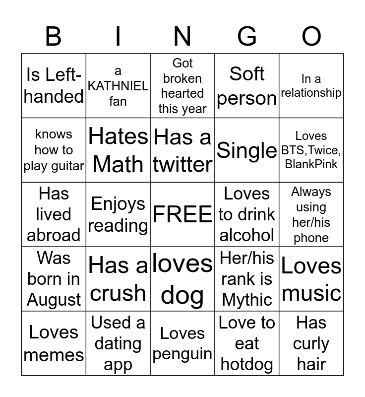 This bingo card has a free space and 24 words: Has a crush, Used a dating app, Has a twitter, Loves memes, In a relationship, Is Left-handed, knows how to play guitar, a KATHNIEL fan, Loves to drink alcohol, loves dog, Single, Has lived abroad, Her/his rank is Mythic, Loves music, Hates Math, Love to eat hotdog, Always using her/his phone, Got broken hearted this year, Loves BTS,Twice, BlankPink, Enjoys reading, Has curly hair, Was born in August, Soft person and Loves penguin.