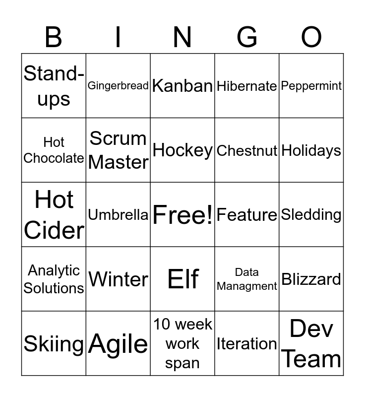 This bingo card has a free space and 29 words: Skiing, Sweater, Umbrella, PI Planning, Stand-ups, Kanban, Scrum Master, Winter, Feature, Agile, Sledding, Dev Team, 10 week work span, Iteration, Holidays, Gnome, Elf, Analytic Solutions, Peppermint, Hot Cider, Data Managment, IM&A, Chestnut, Hot Chocolate, Hibernate, Gingerbread, Blizzard, Hockey and Scarf.