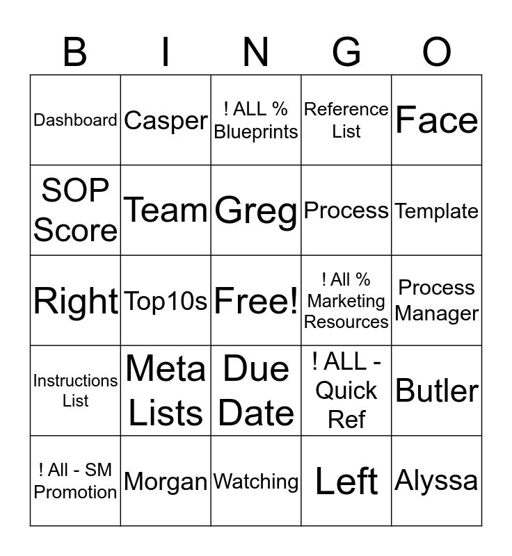 This bingo card has a free space and 24 words: Meta Lists, Morgan, Greg, ! All - SM Promotion, Face, Dashboard, SOP Score, Casper, ! All % Marketing Resources, Due Date, Process, Right, ! ALL - Quick Ref, Butler, Team, Left, Process Manager, ! ALL % Blueprints, Template, Top10s, Alyssa, Instructions List, Reference List and Watching.