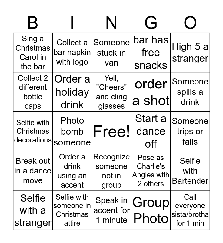 This bingo card has a free space and 24 words: Order a drink using an accent, Selfie with someone in Christmas attire, Yell, "Cheers" and cling glasses, Selfie with a stranger, High 5 a stranger, Sing a Christmas Carol in the bar, Collect 2 different bottle caps, Collect a bar napkin with logo, Start a dance off, Recognize someone not in group, order a shot, Selfie with Christmas decorations, Pose as Charlie's Angles with 2 others, Selfie with Bartender, Order a holiday drink, Group Photo, Someone trips or falls, Someone stuck in van, Someone spills a drink, Photo bomb someone, Call everyone sista/brotha for 1 min, Break out in a dance move, bar has free snacks and Speak in accent for 1 minute.