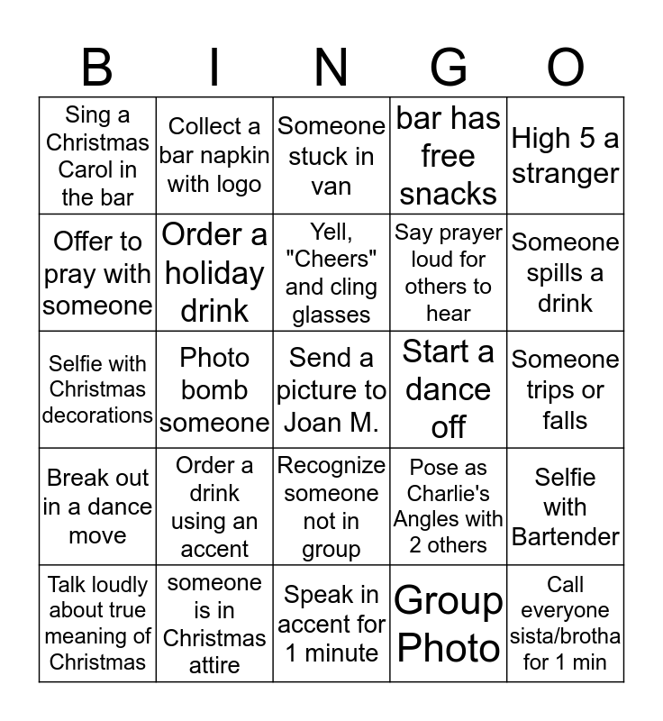 This bingo card has a free space and 24 words: Order a drink using an accent, someone is in Christmas attire, Yell, "Cheers" and cling glasses, Talk loudly about true meaning of Christmas, High 5 a stranger, Sing a Christmas Carol in the bar, Offer to pray with someone, Collect a bar napkin with logo, Start a dance off, Recognize someone not in group, Say prayer loud for others to hear, Selfie with Christmas decorations, Pose as Charlie's Angles with 2 others, Selfie with Bartender, Order a holiday drink, Group Photo, Someone trips or falls, Someone stuck in van, Someone spills a drink, Photo bomb someone, Call everyone sista/brotha for 1 min, Break out in a dance move, bar has free snacks and Speak in accent for 1 minute.
