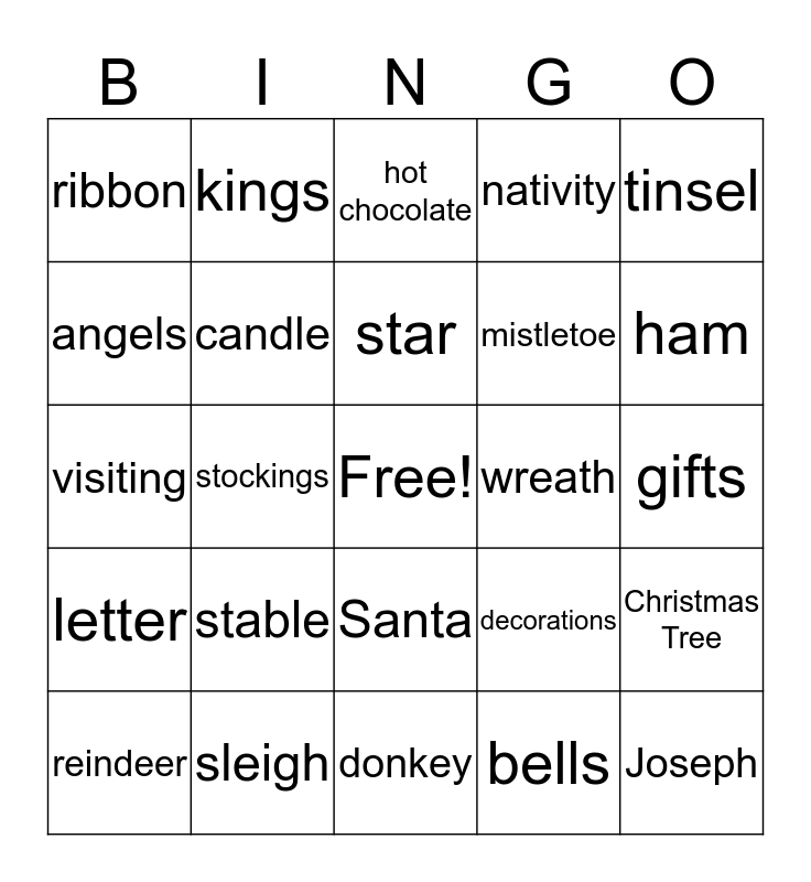This bingo card has a free space and 50 words: Mary, Joseph, Jesus, donkey, stable, Bethlehem, kings, shepherds, angels, crib, candle, nativity, Christmas Tree, decorations, baubles, lights, star, wreath, garland, tinsel, stockings, bells, ribbon, mistletoe, holly, turkey, ham, pudding, hot chocolate, Santa, St. Nicholas, elves, workshop, toys, sleigh, holly, merry, snow, presents, gifts, jingle, giving, receiving, cards, reindeer, visiting, family, lists, letter and wrapping paper.