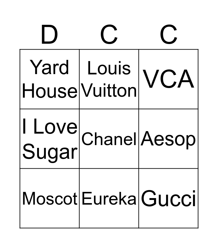 This bingo card has 15 words: Apple, Dior, VCA, Yard House, Eureka, Chanel, Cartier, North Italia, Aesop, Gucci, Eddie V's, I Love Sugar, Moscot, Louis Vuitton and Forward.