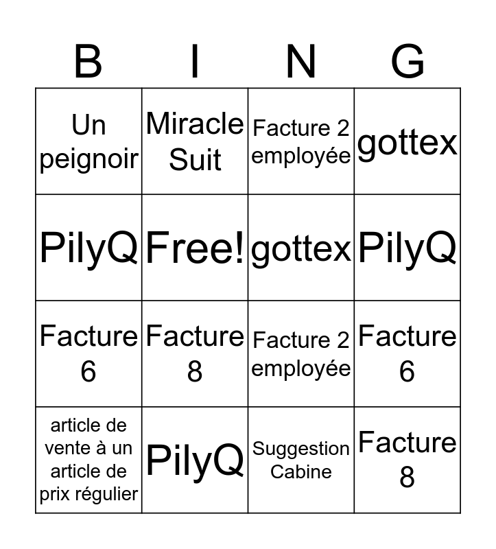 This bingo card has 47 words: article de vente à un article de prix régulier, article de vente à un article de prix régulier, article de vente à un article de prix régulier, article de vente à un article de prix régulier, Miracle Suit, Miracle Suit, Miracle Suit, Miracle Suit, Free!, gottex, gottex, gottex, Dolce Vita, Dolce Vita, Dolce Vita, Dolce Vita, PilyQ, PilyQ, PilyQ, PilyQ, Facture 6, Client achetant pour lui et sa famille, Un peignoir, Facture 6, Facture 6, Facture 8, Facture 8, Facture 8, Facture 8, Facture 8, Facture 10, Un peignoir, Facture 10, Facture 10, Un peignoir, Suggestion Cabine, Suggestion Cabine, Suggestion Cabine, Suggestion Cabine, Suggestion Cabine, Facture 2 employée, Facture 2 employée, Facture 2 employée, Facture 2 employée, Facture 2 employée, free and free.