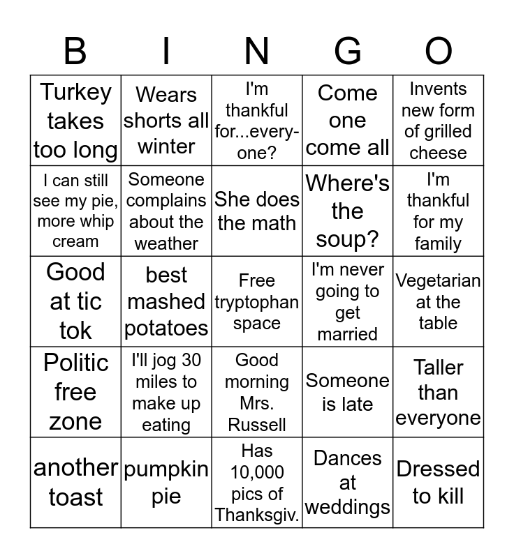 This bingo card has a free space and 29 words: another toast, love that champagne, best mashed potatoes, Where's the gravy?, Turkey takes too long, I'm thankful for...every-one?, Someone complains about the weather, I'll jog 30 miles to make up eating, I'm never going to get married, pumpkin pie, Vegetarian at the table, Dressed to kill, Has 10,000 pics of Thanksgiv., Dances at weddings, I'm thankful for my family, Good at games, Good morning Mrs. Russell, Politic free zone, Invents new form of grilled cheese, Good at tic tok, Someone is late, When I was your age I walked 50 miles, Where's the soup?, I can still see my pie, more whip cream, Come one come all, Wears shorts all winter, Taller than everyone, She does the math and No pecan pie?.