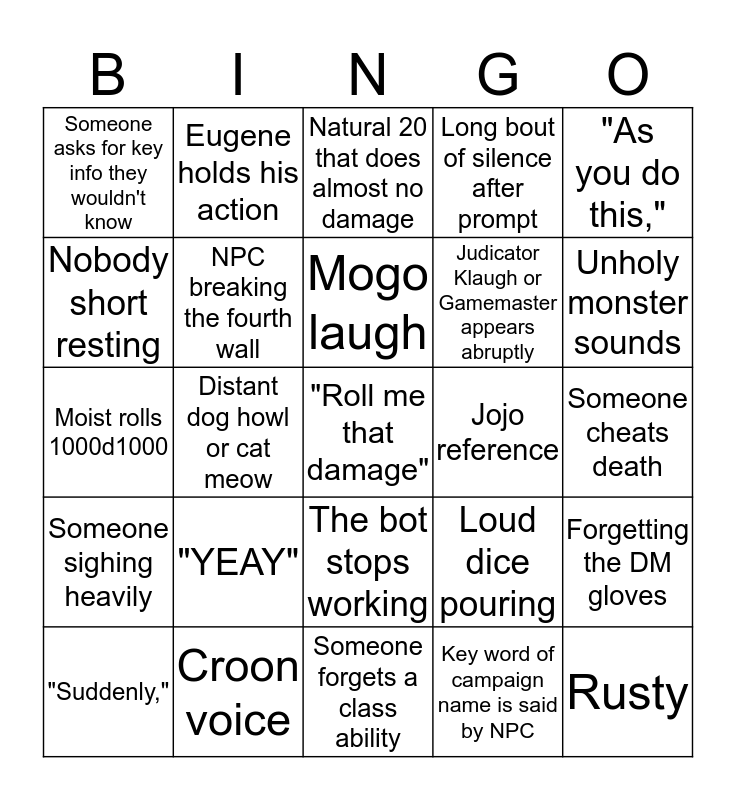 This bingo card has a free space and 24 words: "YEAY", Croon voice, Mogo laugh, "Suddenly,", "As you do this,", Someone asks for key info they wouldn't know, Nobody short resting, Eugene holds his action, Jojo reference, The bot stops working, Judicator Klaugh or Gamemaster appears abruptly, Moist rolls 1000d1000, Loud dice pouring, Forgetting the DM gloves, NPC breaking the fourth wall, Key word of campaign name is said by NPC, Someone cheats death, Natural 20 that does almost no damage, Unholy monster sounds, Distant dog howl or cat meow, Rusty, Someone sighing heavily, Long bout of silence after prompt and Someone forgets a class ability.