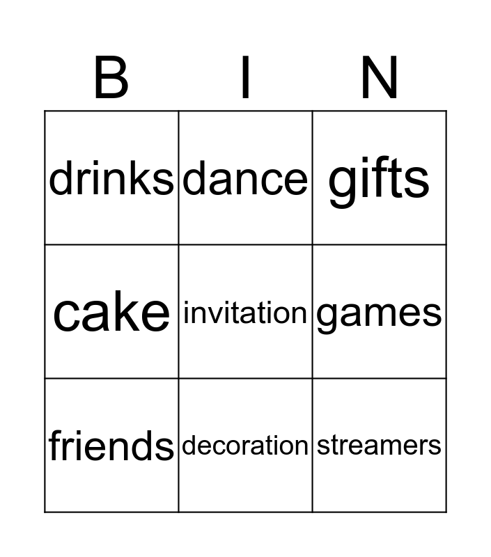 This bingo card has a free space and 8 words: games, gifts, dance, friends, drinks, streamers, cake and decoration.