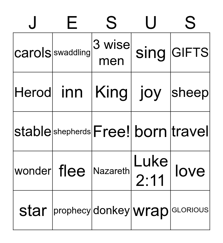 This bingo card has a free space and 74 words: Mary, Joseph, 3 wise men, Dec 25, manger, baby, JOHN 3:16, Jesus, star, nativity, Emmanuel, Redeemer, King, Herod, Messiah, shepherds, flock, sheep, lamb, stable, inn, swaddling, sing, tidings, GLORIOUS, REJOICE, EGYPT, PRAISE, MAGI, CAMELS, GIFTS, MYRRH, FRANKINCENSE, ALLELUIA, hay, wrap, Bethlehem, holy, virgin, Advent, donkey, prophecy, Christmas, Christ, savior, carols, goodwill, flee, give, celebrate, tax, angel, travel, miracle, pray, worship, Nazareth, faith, hope, love, joy, peace, wonder, awe, born, Luke 2:8,9, Gal 4:4,5, Isaiah 9:6, Luke 2:11, Bible, Matt 1:23, Isaiah 7:14, Matt 1:21 and Luke 1:35.