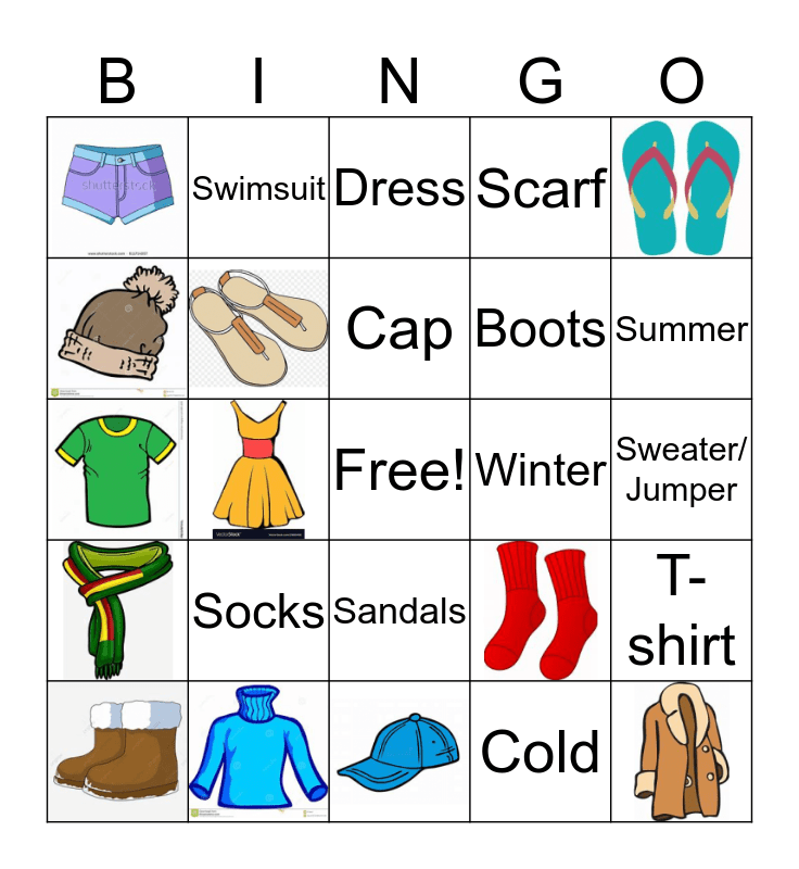 This bingo card has 14 images, a free space and 15 words: Hot, Dress, Socks, Winter, Sweater/ Jumper, Cold, Summer, Gloves, Sandals, Boots, Scarf, Swimsuit, T-shirt, Cap and Shorts.