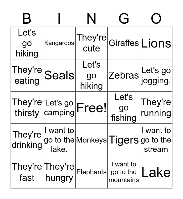 This bingo card has a free space and 24 words: I want to go to the lake., They're hungry, Let's go hiking, They're fast, Lions, Let's go hiking, They're eating, Kangaroos, Let's go fishing, Monkeys, Zebras, They're thirsty, Tigers, I want to go to the stream, Seals, I want to go to the mountains, They're running, They're cute, Let's go jogging., Let's go camping, Lake, They're drinking, Giraffes and Elephants.