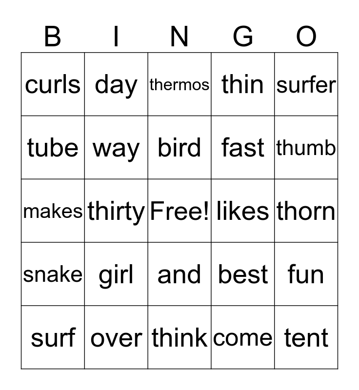 This bingo card has a free space and 24 words: girl, over, bird, surf, surfer, curls, tube, day, likes, and, fast, makes, best, fun, way, come, thorn, thermos, thumb, thirty, tent, snake, thin and think.