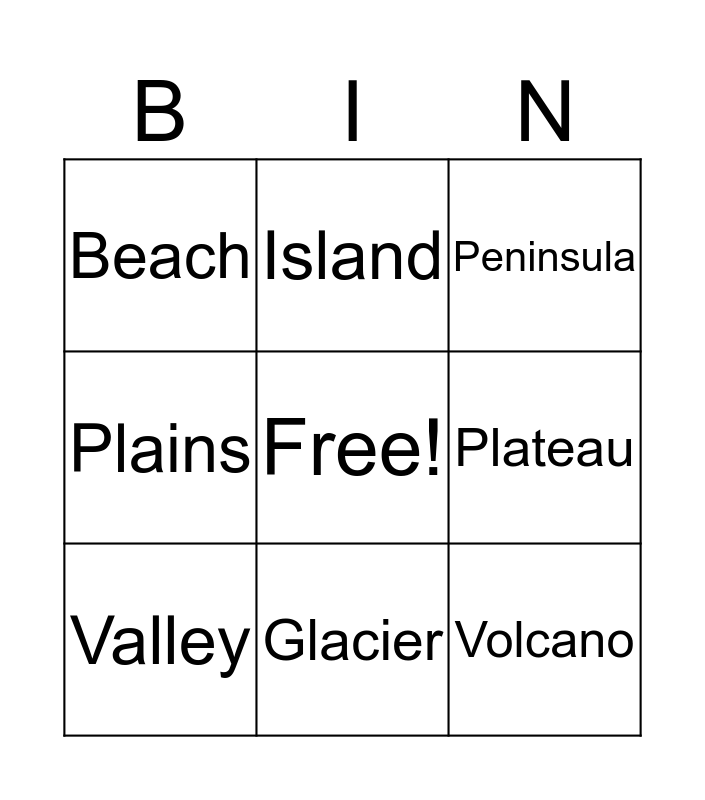 This bingo card has a free space and 14 words: Canyon, Mountain, Valley, Island, Plains, Volcano, Cave, Hill, Glacier, Beach, Desert, Plateau, Peninsula and Cliff.