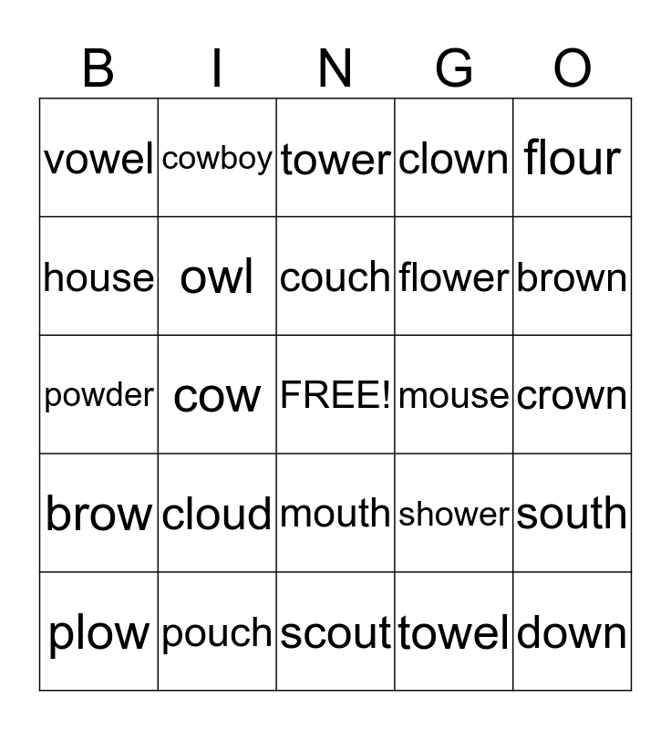 This bingo card has a free space and 24 words: cloud, pouch, couch, plow, flour, vowel, house, cowboy, mouse, mouth, flower, powder, shower, south, owl, towel, crown, tower, brown, cow, down, brow, clown and scout.