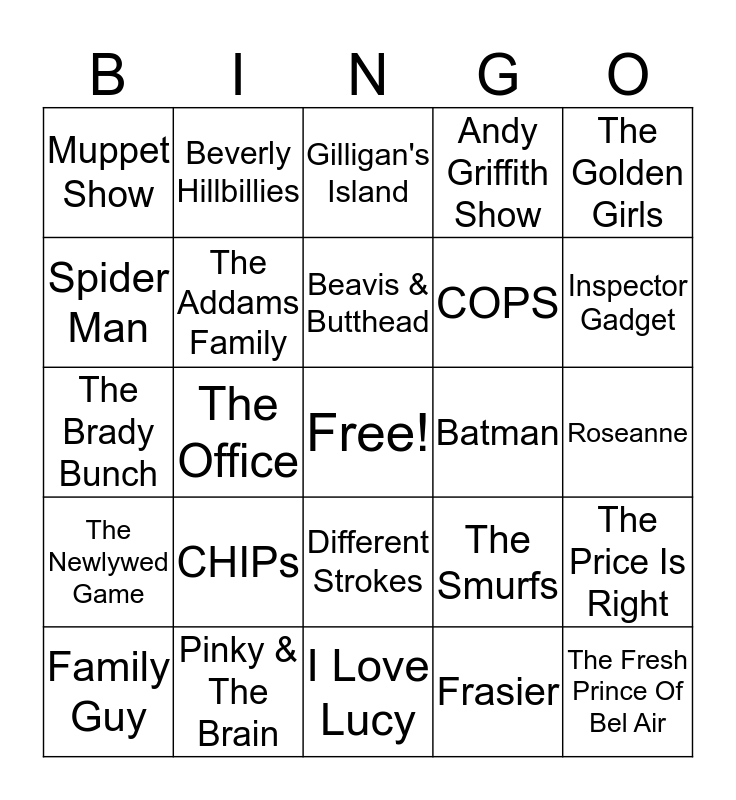 This bingo card has a free space and 75 words: Happy Days, Cheers, Gilligan's Island, Love Boat, Dukes Of Hazzard, Laverne & Shirley, Welcome Back kotter, Star Trek, Law & Order, NCIS, The Simpsons, King Of The Hill, Beavis & Butthead, Spider Man, Big Bang Theory, The Office, Parks & Recreation, The Fresh Prince Of Bel Air, Seinfeld, The Golden Girls, ER, The Brady Bunch, The Addams Family, Beverly Hillbillies, Andy Griffith Show, Leave It To Beaver, The Jeffersons, Sanford & Son, Breaking Bad, The Flintstones, The Jetsons, Scooby Doo, Popeye, The Smurfs, Inspector Gadget, COPS, American Idol, Modern Family, Roseanne, Frasier, Friends, Monty Python's Flying Circus, SpongeBob Square Pants, Looney Tunes, Pink Panther, Yogi Bear, Family Guy, Muppet Show, Mr. Ed, I Dream Of Jeannie, Bewitched, Different Strokes, Green Acres, Full House, Family matters, Home Improvement, Married With Children, Stranger Things, Miami Vice, Hawaii Five O, CHIPs, Magnum PI, Peter Gunn, Mission Impossible, Charlie's Angels, Batman, Saved By The Bell, Jeopardy, Family Feud, The Price Is Right, The Newlywed Game, Pinky & The Brain, Beverly Hills 90210, I Love Lucy and The Munsters.