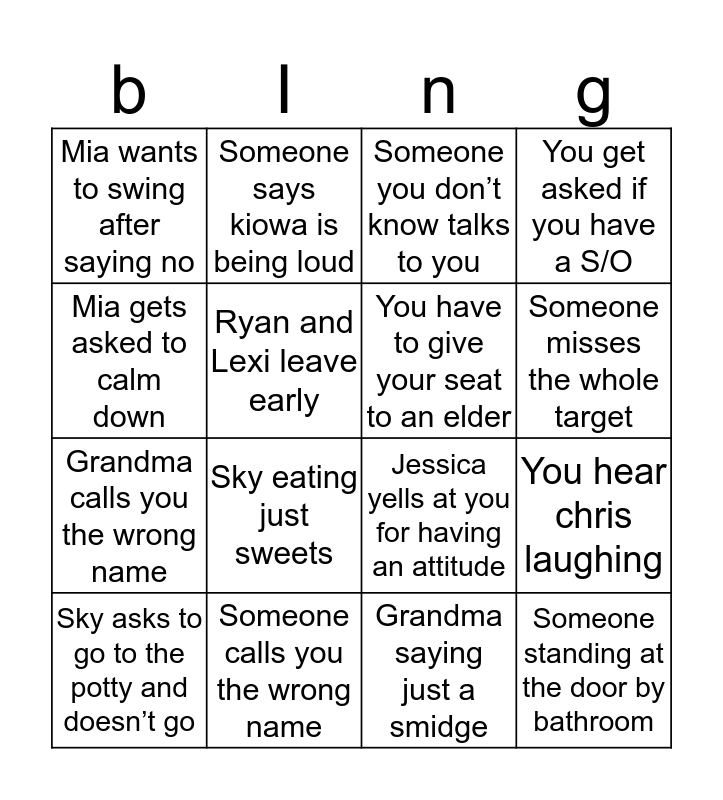 This bingo card has 16 words: Sky asks to go to the potty and doesn’t go, Someone calls you the wrong name, Someone you don’t know talks to you, You get asked if you have a S/O, Mia gets asked to calm down, Someone says kiowa is being loud, Jessica yells at you for having an attitude, You hear chris laughing, Mia wants to swing after saying no, Ryan and Lexi leave early, Grandma saying just a smidge, Someone misses the whole target, Grandma calls you the wrong name, Sky eating just sweets, You have to give your seat to an elder and Someone standing at the door by bathroom.