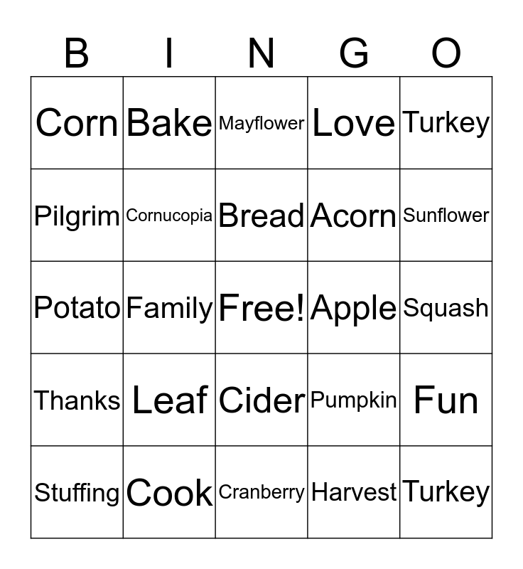 This bingo card has a free space and 29 words: Stuffing, Pie, Family, Hay, Corn, Mayflower, Cornucopia, Leaf, Apple, Cook, Squash, Turkey, Cranberry, Harvest, Sunflower, Dinner, Cider, Thanks, Turkey, Potato, Pumpkin, Autumn, Acorn, Pilgrim, Love, Bake, Fun, Bread and Veggies.
