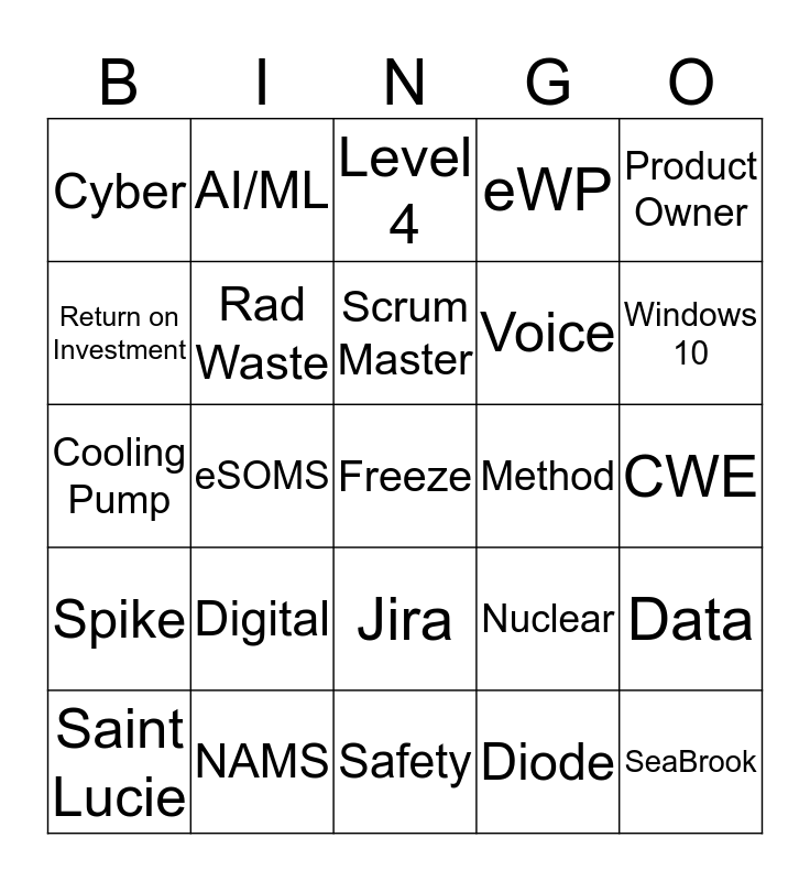 This bingo card has 40 words: Agile, Cooling Pump, RCS, Rad Waste, NAMS, Jira, Scrum Master, Sprint, Product Owner, Spike, eSOMS, eWP, Freeze, CWE, Method, Digital, Transformation, Cyber, CDA, Level 4, Data, Diode, Voice, Return on Investment, On-Call, Southern Region, Duane Arnold, Jupiter West, SeaBrook, Point Beach, Turkey Point, Saint Lucie, Northern Region, Nuclear, Windows 10, Safety, Web Portal, P6, AI/ML and VBM.