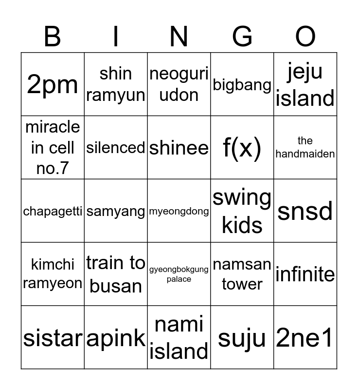 This bingo card has a free space and 24 words: train to busan, apink, shinee, sistar, jeju island, 2pm, miracle in cell no.7, shin ramyun, swing kids, gyeongbokgung palace, f(x), chapagetti, namsan tower, infinite, silenced, suju, snsd, neoguri udon, the handmaiden, samyang, 2ne1, kimchi ramyeon, bigbang and nami island.