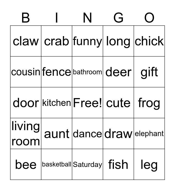 This bingo card has a free space and 24 words: aunt, basketball, bathroom, bee, chick, claw, cousin, crab, cute, dance, deer, door, draw, elephant, fence, fish, frog, funny, gift, kitchen, leg, living room, long and Saturday.