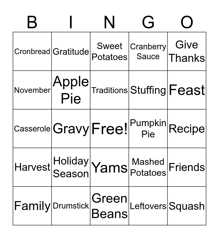 This bingo card has a free space and 24 words: Family, Holiday Season, Traditions, Leftovers, Give Thanks, Cronbread, Gratitude, Sweet Potatoes, Pumpkin Pie, Recipe, Casserole, Apple Pie, Mashed Potatoes, Friends, November, Drumstick, Green Beans, Cranberry Sauce, Feast, Harvest, Gravy, Yams, Stuffing and Squash.