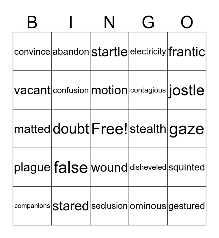 This bingo card has a free space and 29 words: companions, improvise, doubt, parallel, convince, startle, confusion, false, stealth, stared, gaze, gestured, seclusion, ominous, jostle, surpress, wound, plague, frantic, matted, disheveled, stench, contagious, vacant, electricity, abandon, squinted, motion and sequence.
