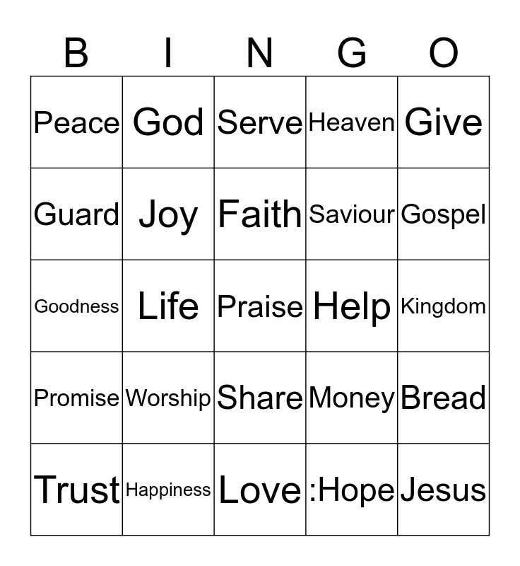 This bingo card has 25 words: Worship, Love, Faith, Trust, Give, Peace, Guard, God, Help, Share, Saviour, Goodness, Money, Bread, Joy, Jesus, Kingdom, Serve, Gospel, Life, Praise, Happiness, Promise, Heaven and :Hope.
